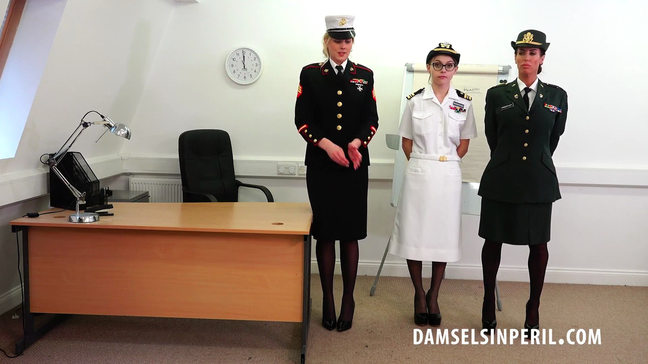 Poppy and Charlie gasp, stepping in to shield her, but the contagion of humiliation is airborne. As Poppy moves to assist, the closure of her Marine skirt gives way, sliding down her legs to reveal black suspenders and lace panties against her pale skin. The dominoes are falling fast. Officer Charlie, the last line of defense, looks down in horror as her own Army skirt unzips and joins the others on the floor, exposing her dark blue lingerie.